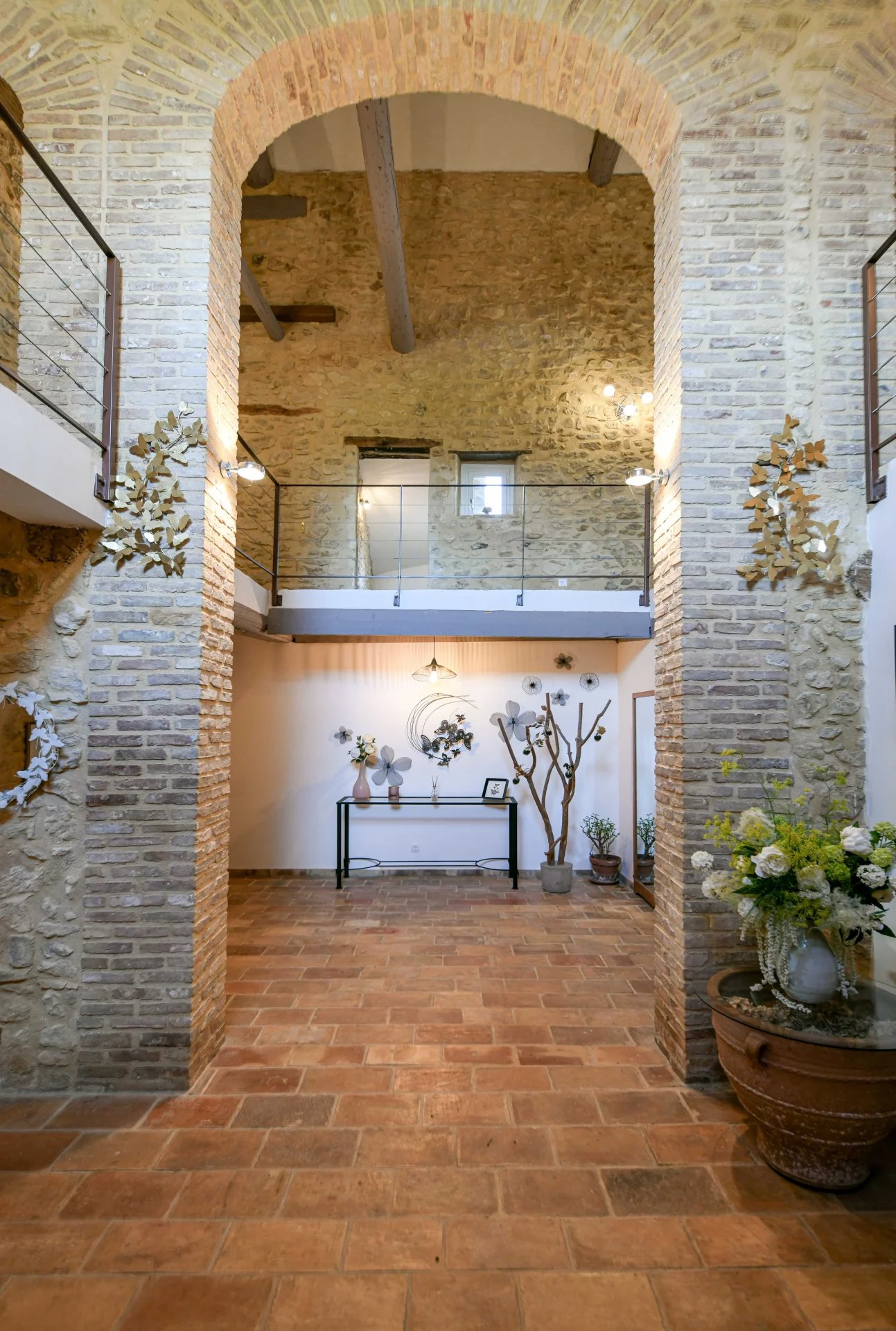 The main body of the property covers 368 m² and offers a series of living rooms covering more than 107 m² on the ground floor. The double-height entrance hall is stunning in its volume and splendour. An interior passageway overlooks it, giving it the feel of a grand historic building. On its left side, the large living room opens onto the dining room through two stone arches, followed by the fitted kitchen. Numerous windows and French windows opening onto the terrace and garden give this space a beautiful luminosity. On the other side of the entrance hall, two suites (15 and 24 m²) complete this level, along with the laundry room and guest toilet.