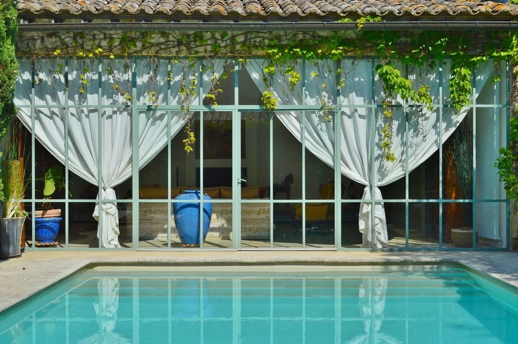 The veranda, or summer room, benefits from a wide glazed section opening onto the swimming pool. The high ceilings (4.3 m/14 feet) give this room a particularly seductive appeal (exposed beams).