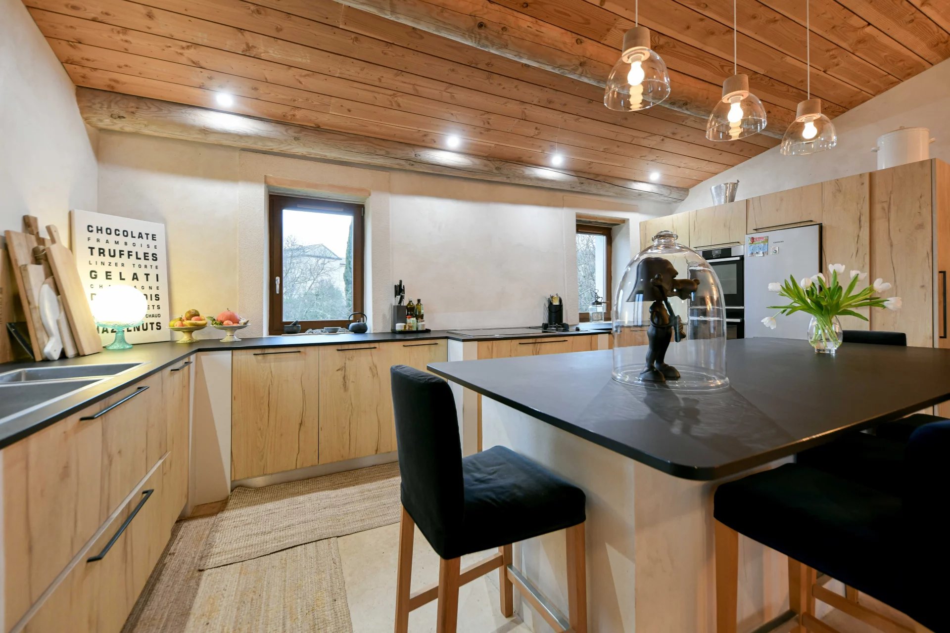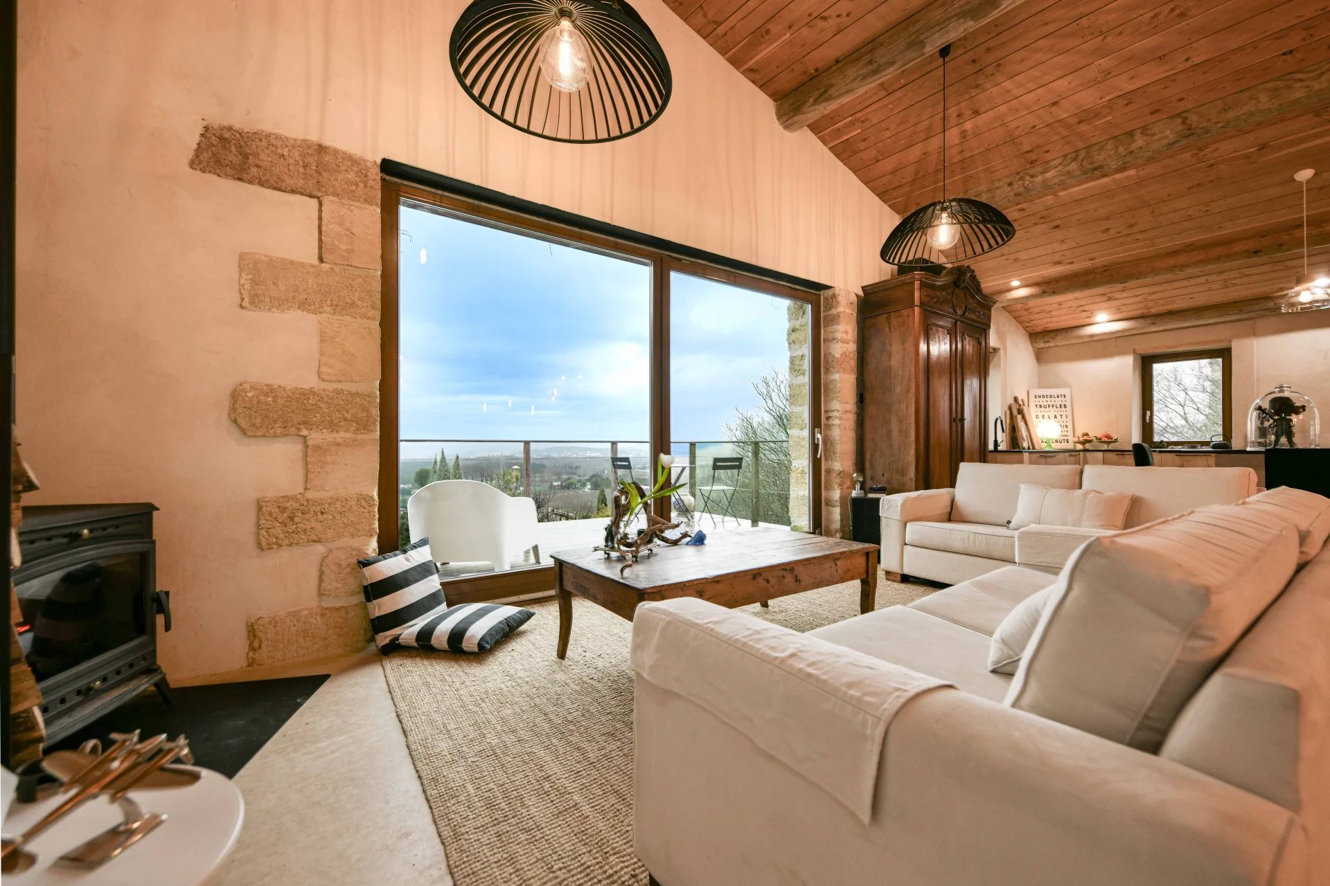 As soon as you enter, you will be charmed by the peaceful atmosphere of the cathedral-style living room, enhanced by beautiful exposed beams and a wood-burning stove. Bathed in light thanks to large bay windows, this space opens onto a terrace, with an exceptional view of the countryside and the Cévennes mountains as a backdrop. A staircase then leads you easily to the garden.
