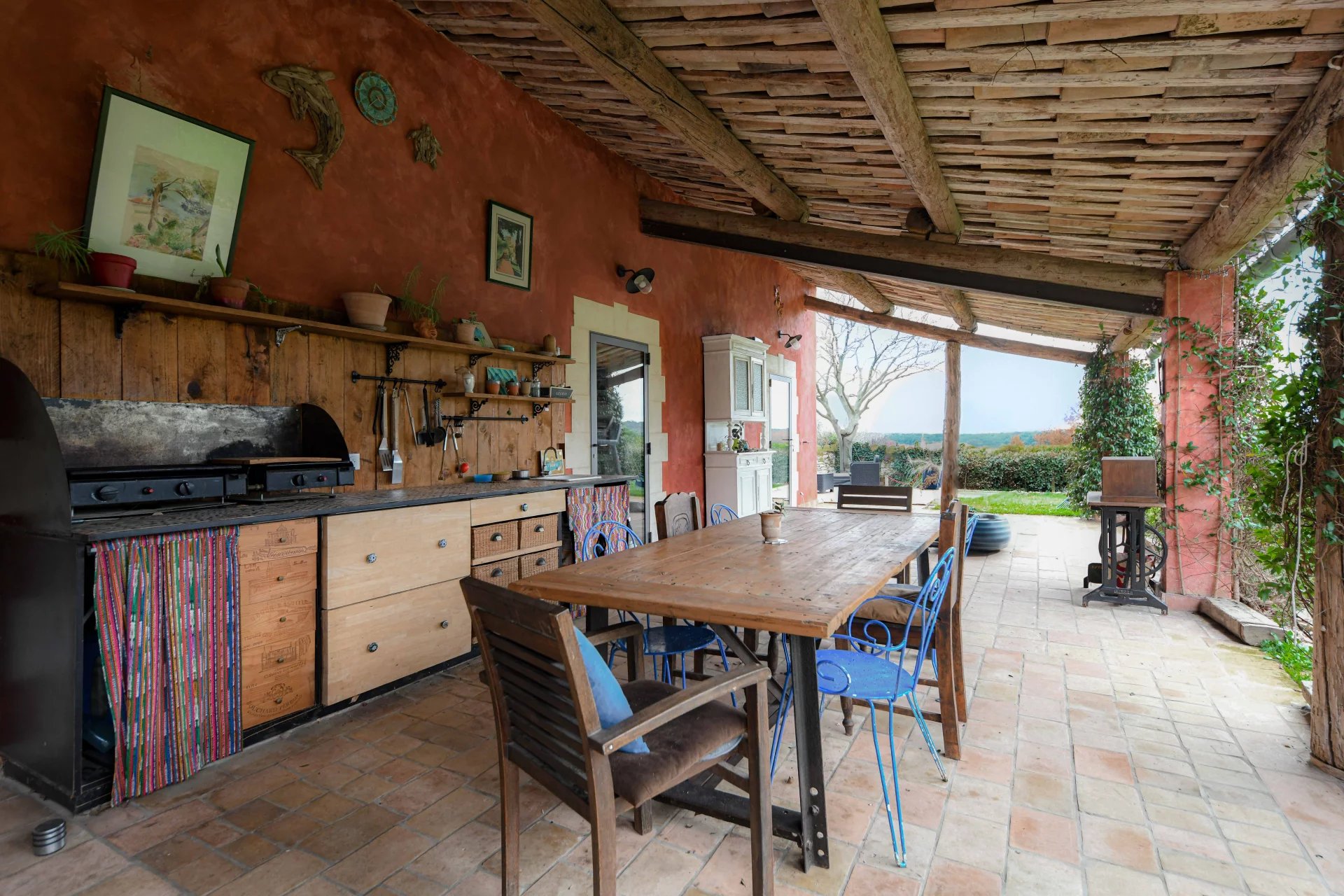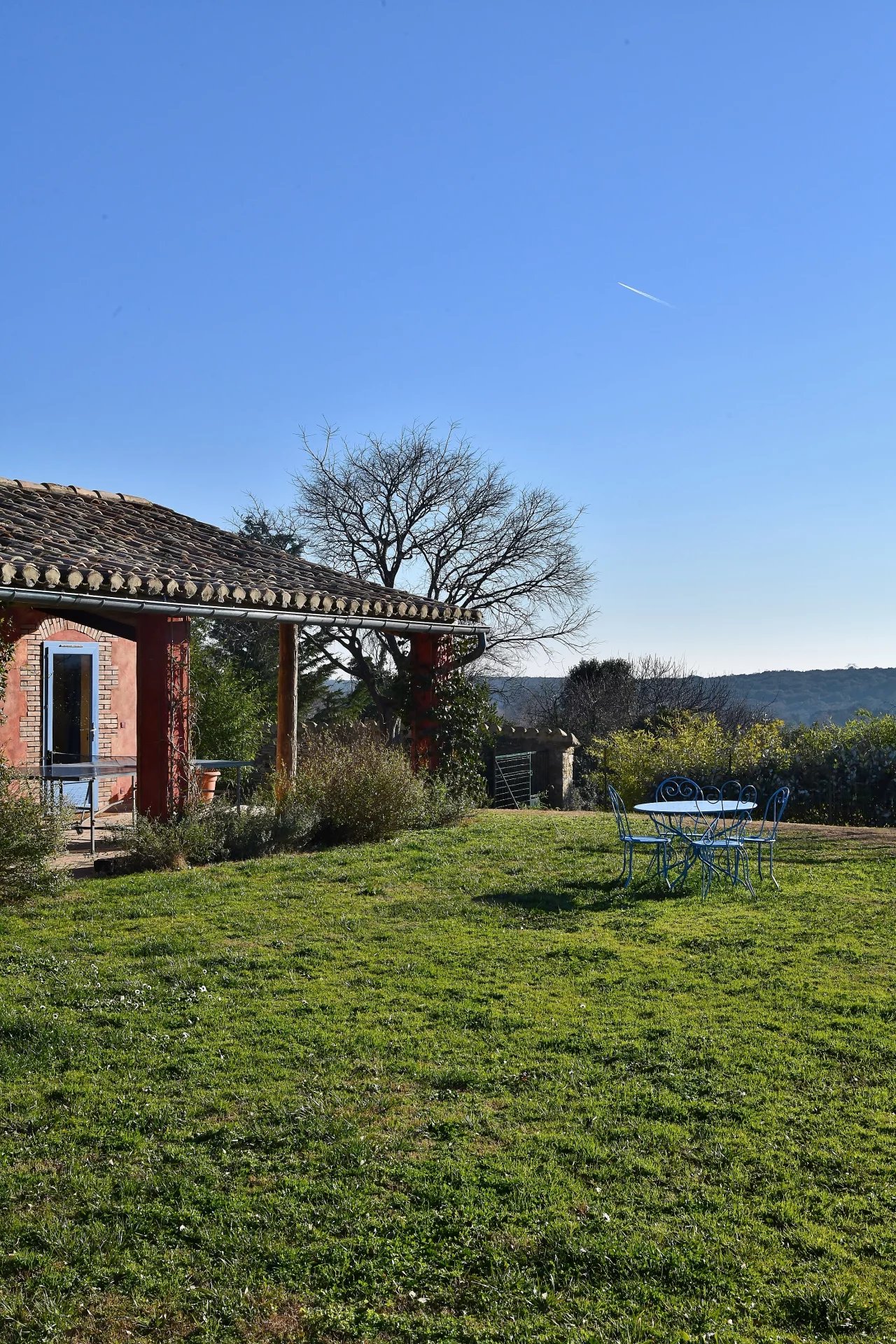 From the covered terrace, but also from the garden, a pleasant view of the countryside and the surrounding hills provides privacy.