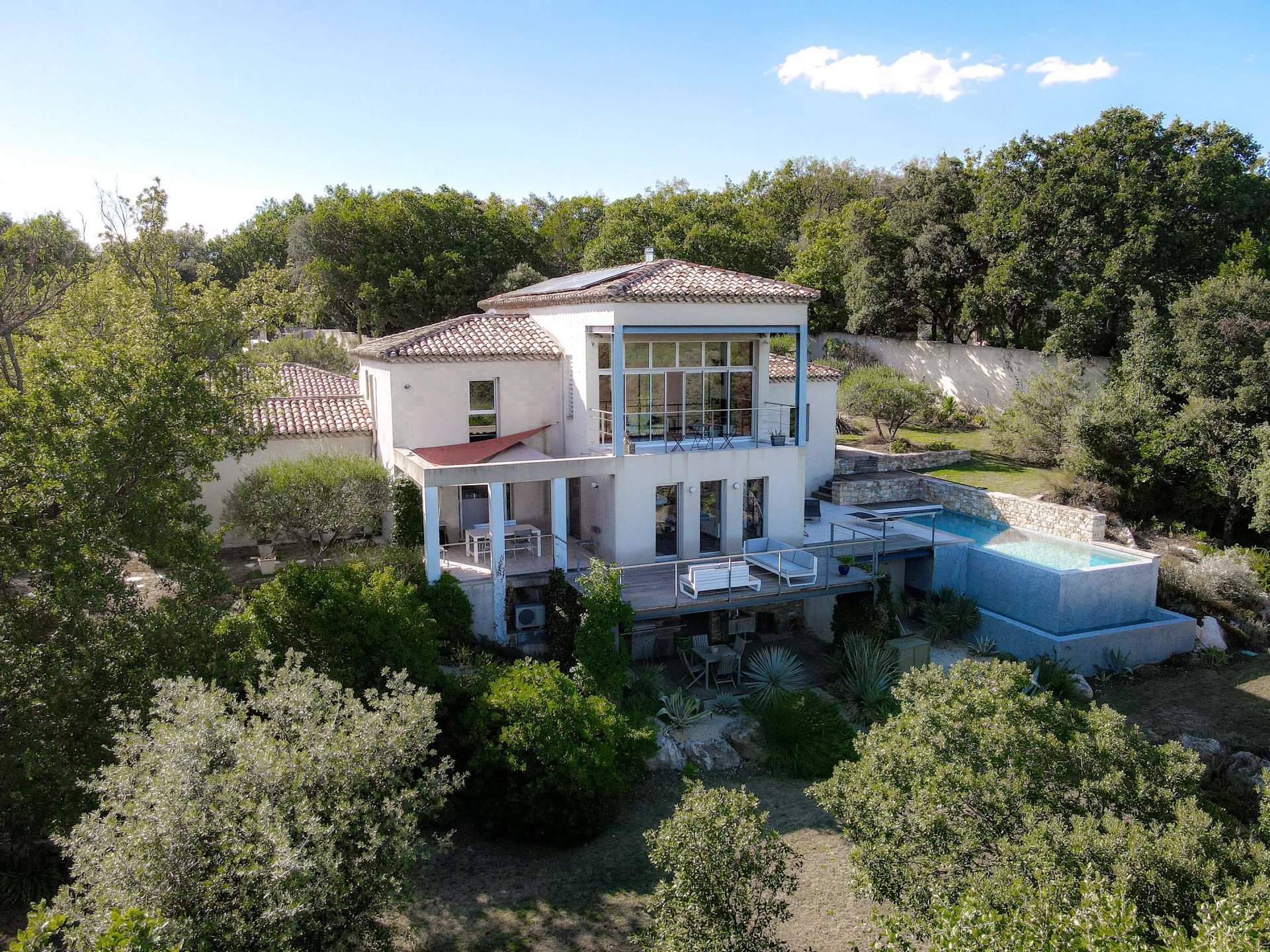 This contemporary 220 m² property is ideally situated on a hillside on the edge of one of the region’s most sought-after villages, 8 km from Uzès.