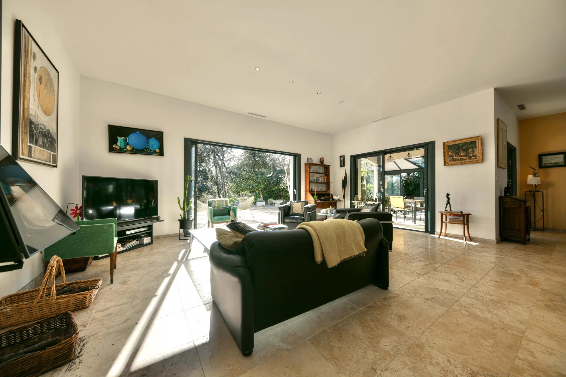 The entire property opens through elegant sliding pocket doors onto a large paved terrace with a swimming pool overlooking the 3,500 m² landscaped park planted with native Mediterranean species.