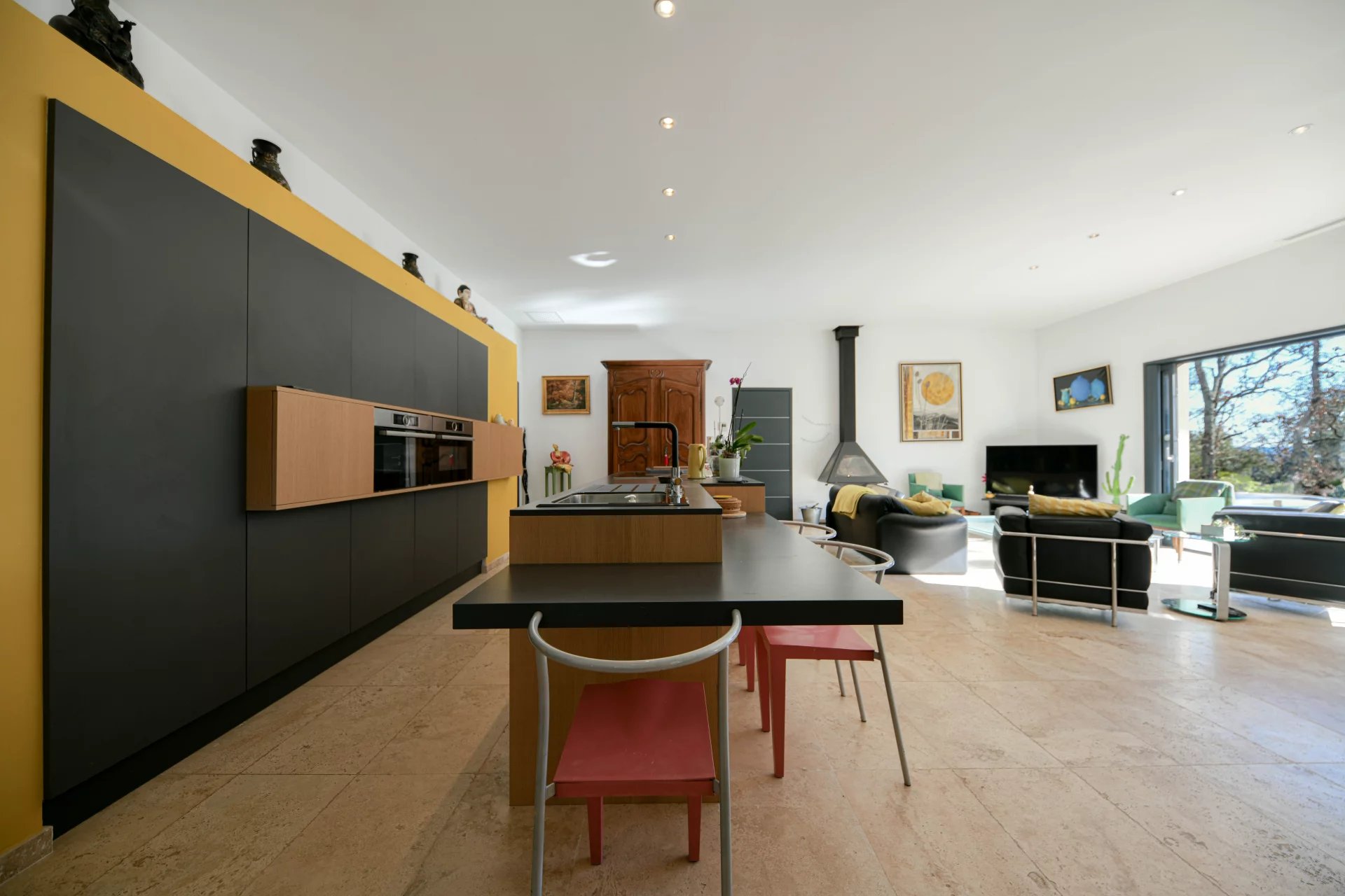 The entire property opens through elegant sliding pocket doors onto a large paved terrace with a swimming pool overlooking the 3,500 m² landscaped park planted with native Mediterranean species.