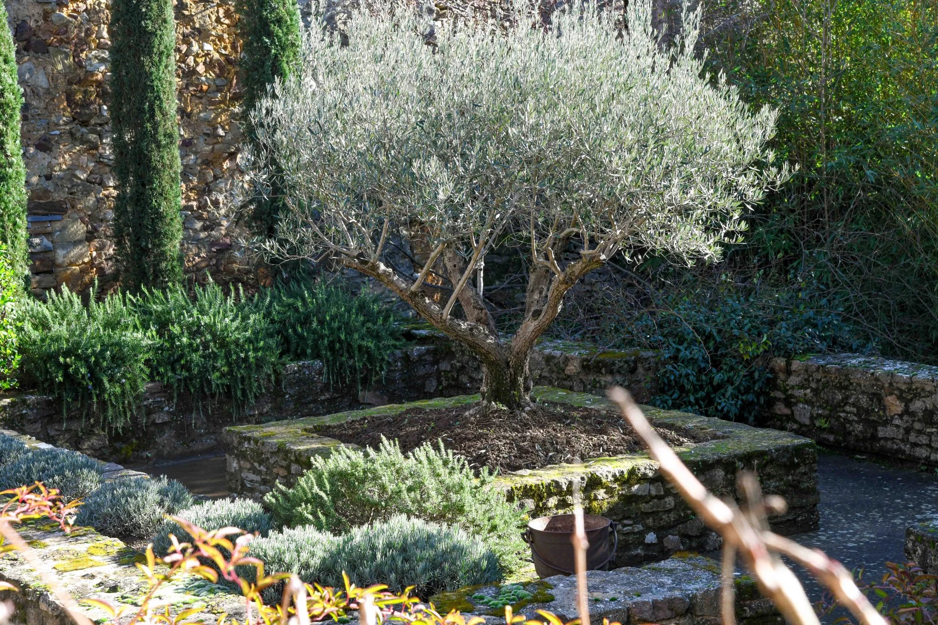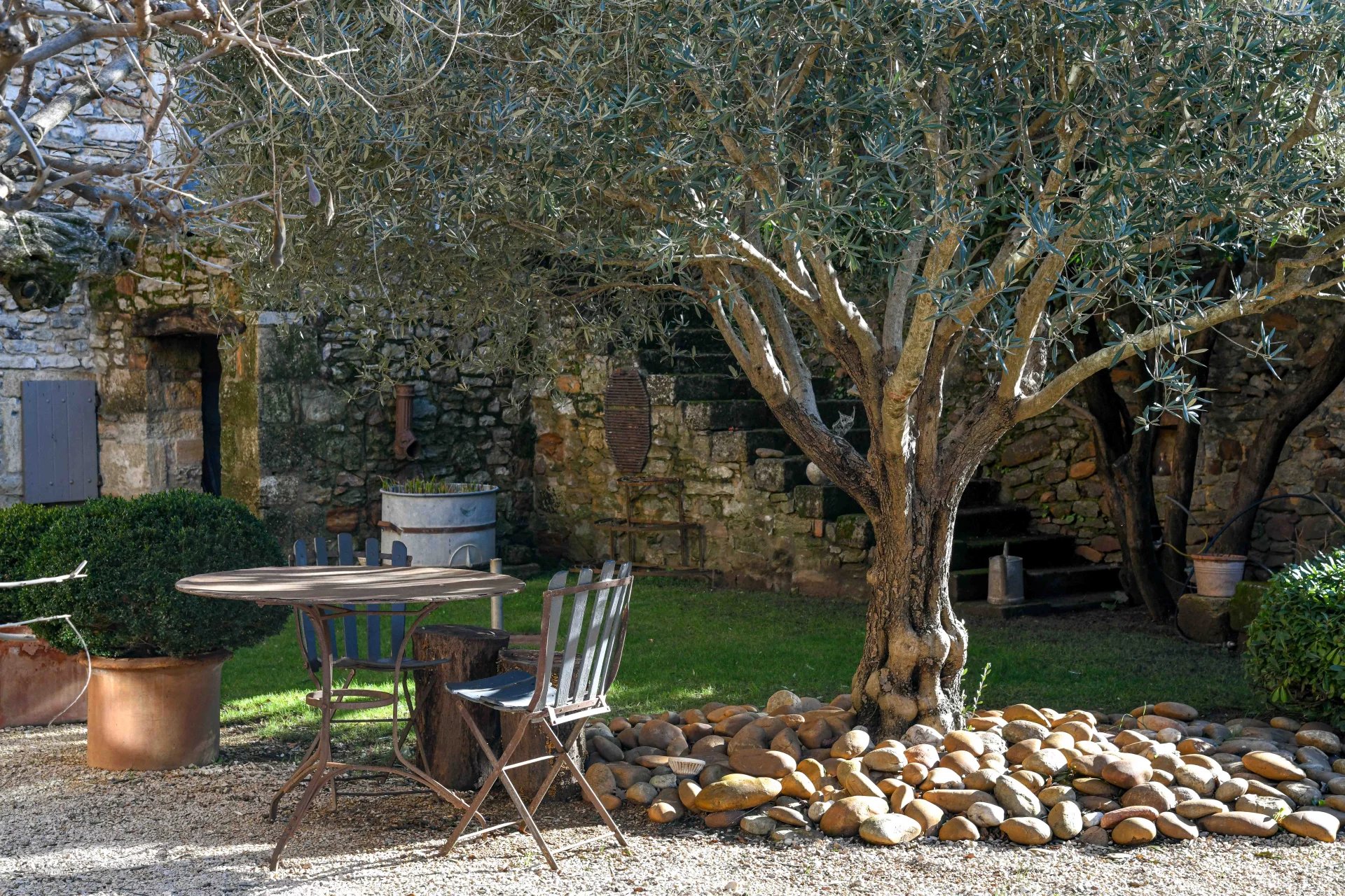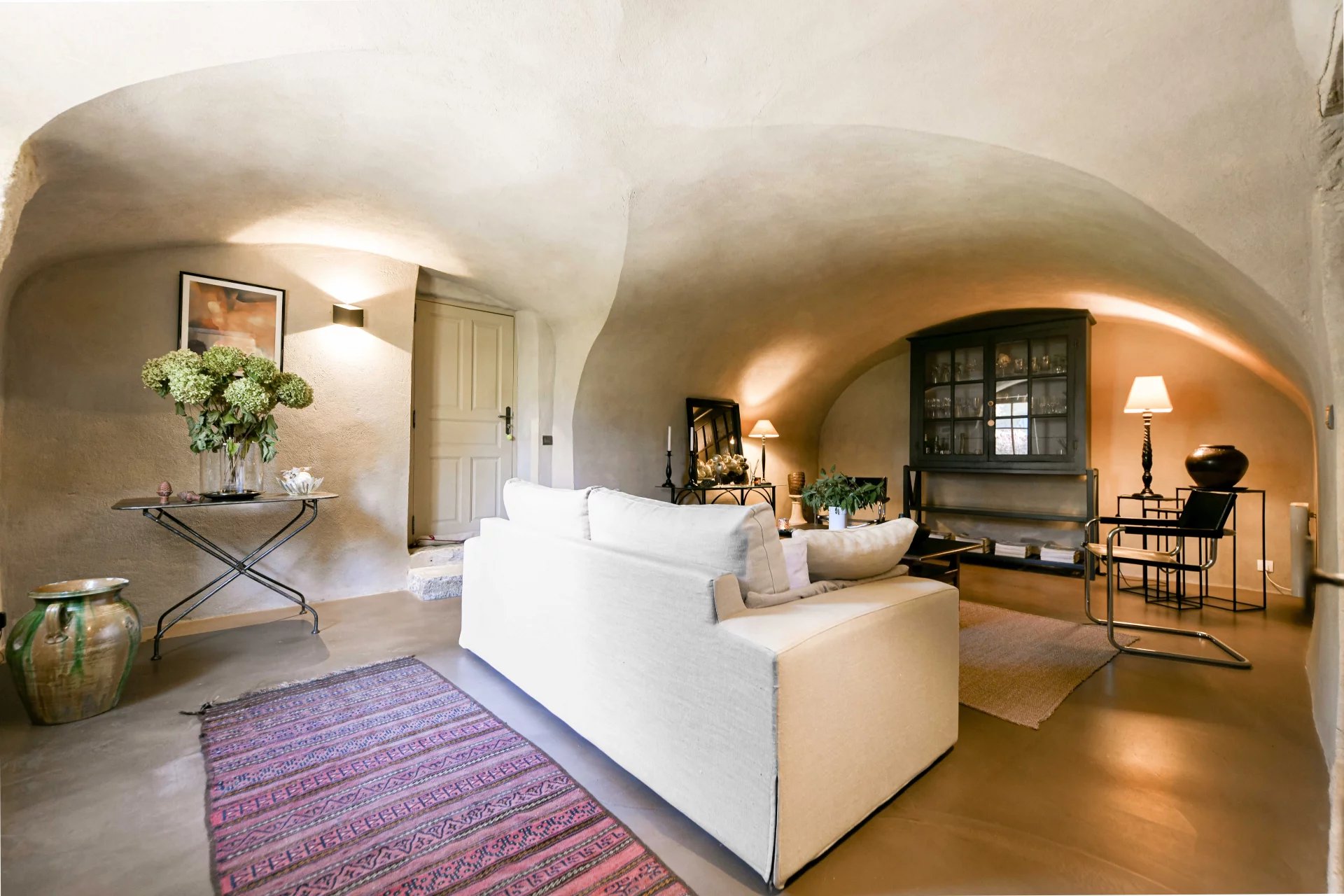 The garden of over 1200 m² opens up in front of the building to the west and offers a remarkable swimming pool area (8 x 3 m, chlorine filtration) with a view of the village church as well as delightful corners for relaxing. A summer lounge is perfectly located under a beautiful vaulted space.