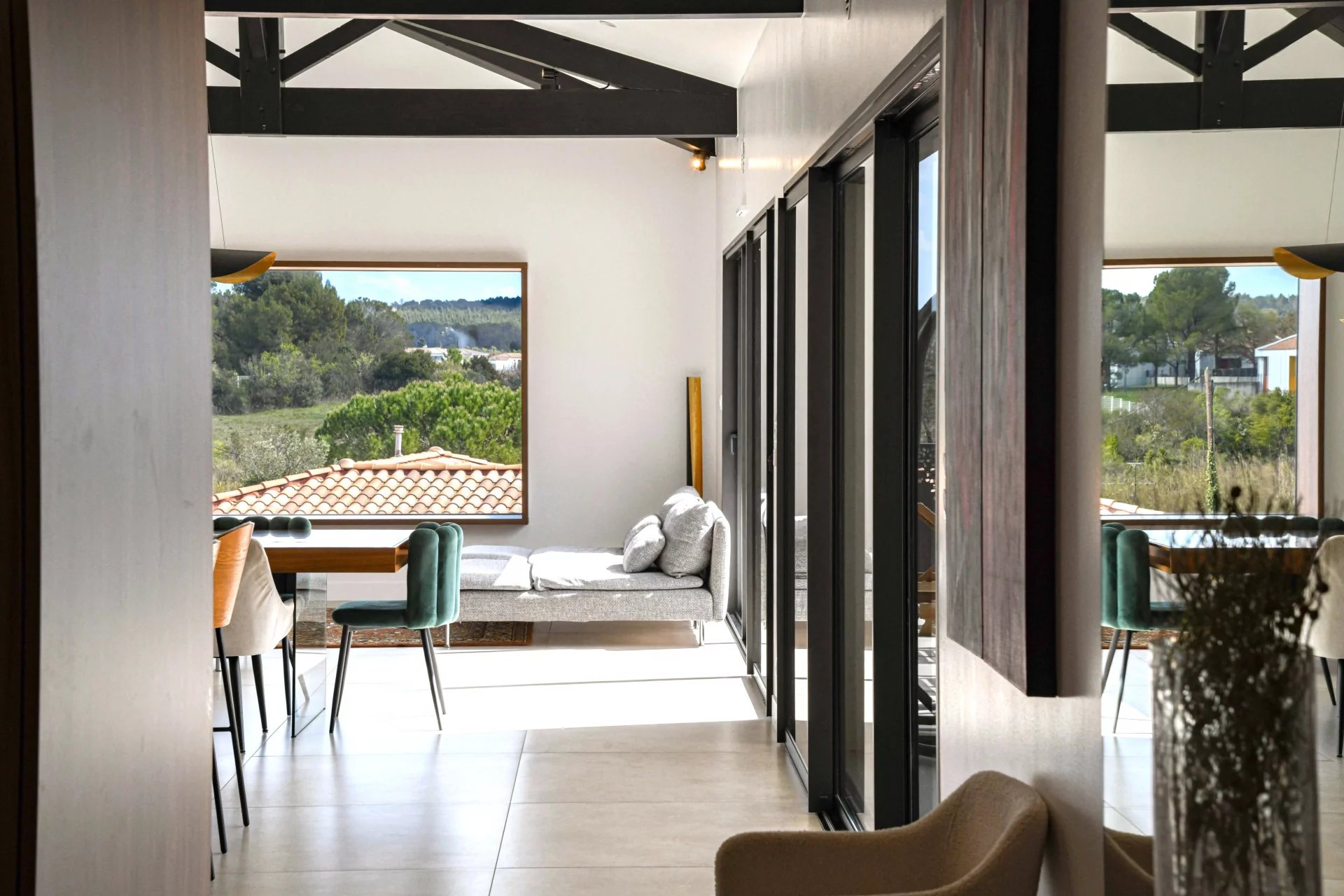 The terrace features several seating areas, a bioclimatic pergola and a swimming pool. It overlooks the garden and offers exceptional views of the countryside and the surrounding hills.