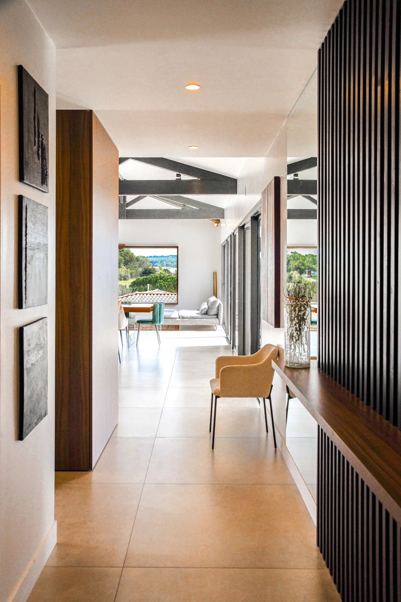 The sleeping area, arranged in an intimate layout, comprises a hallway leading to 4 bedrooms and 3 bathrooms. This area includes a comfortable master suite opening onto the terrace, featuring a bedroom, dressing room and bathroom.