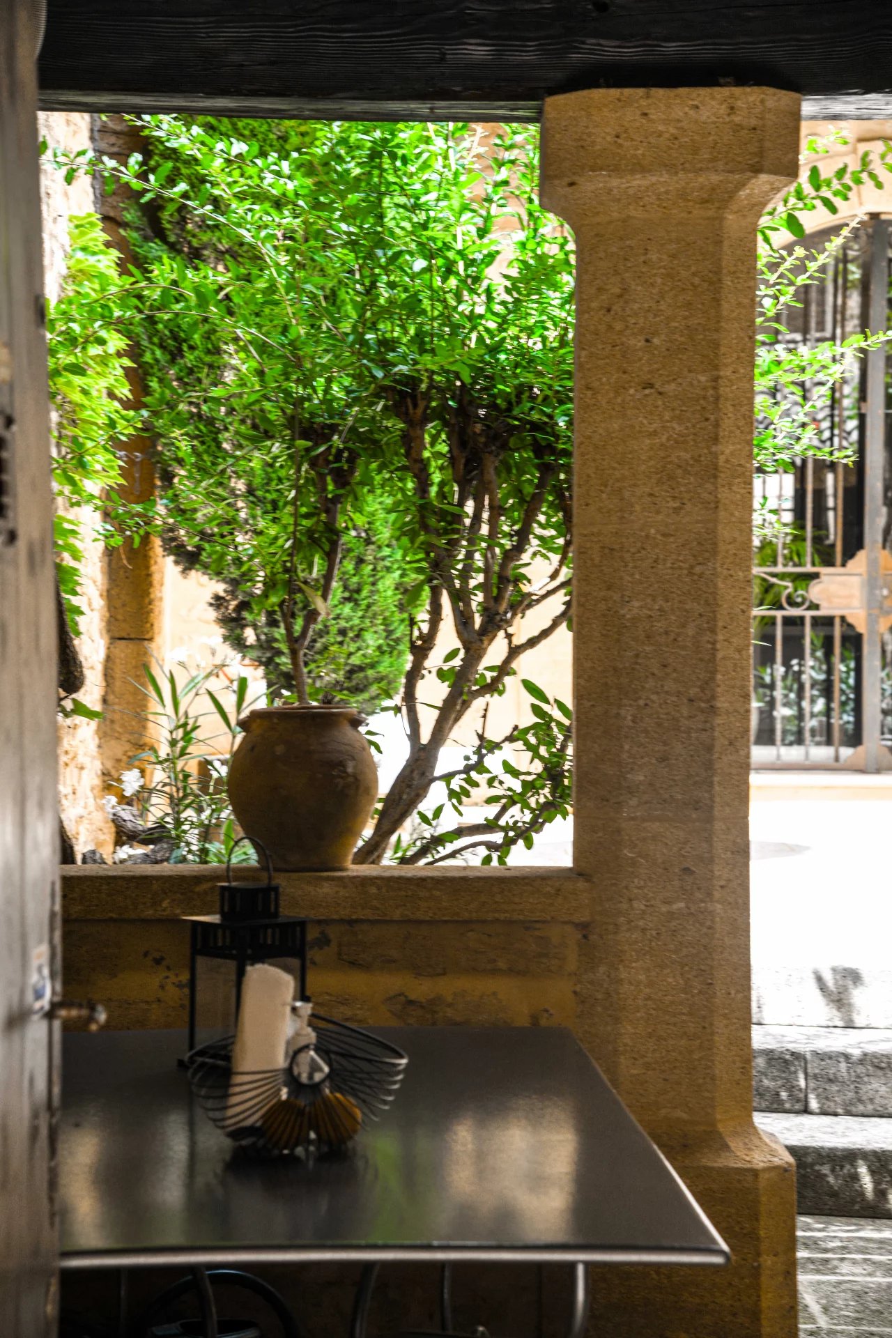 Depuis une ruelle pavée et fleurie, dans le cœur historique d’un village médiéval avec commerces, un élégant porche en pierre ouvre sur un patio arboré.