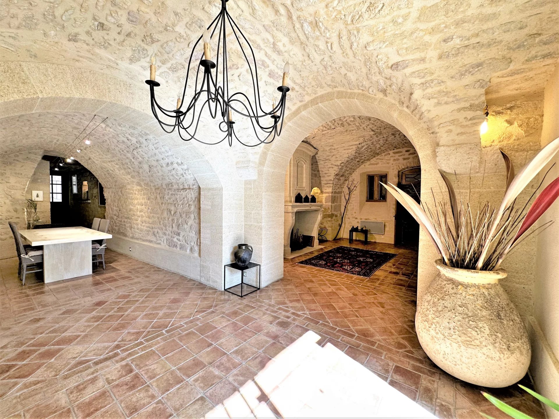 La confortable et lumineuse entrée dessert l’ensemble de réception vouté de 60 m², salon en double croisée d’ogives avec cheminée en pierre, salle à manger et cuisine équipée et aménagée. Sous la cuisine, une cave à vin.