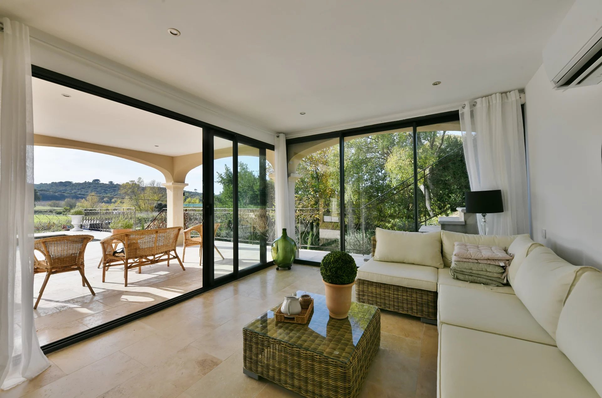Bel ensemble de réception lumineux de 63 m² ouvert sur une terrasse avec piscine surplombant la campagne