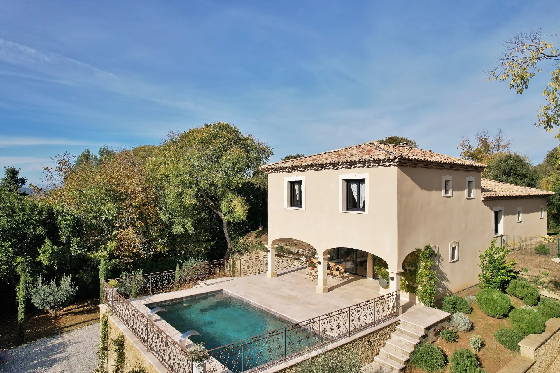 Terrain paysagé et arboré, piscine. Ascenseur, double garage