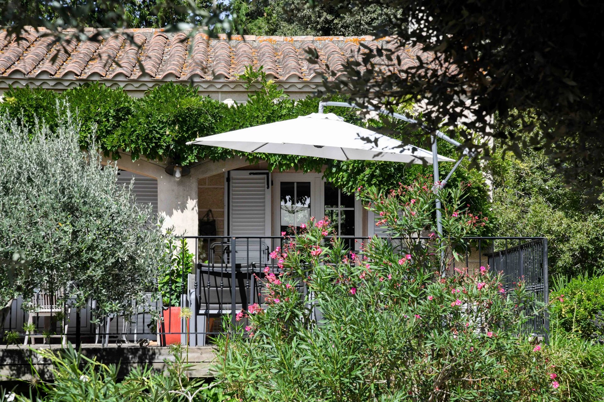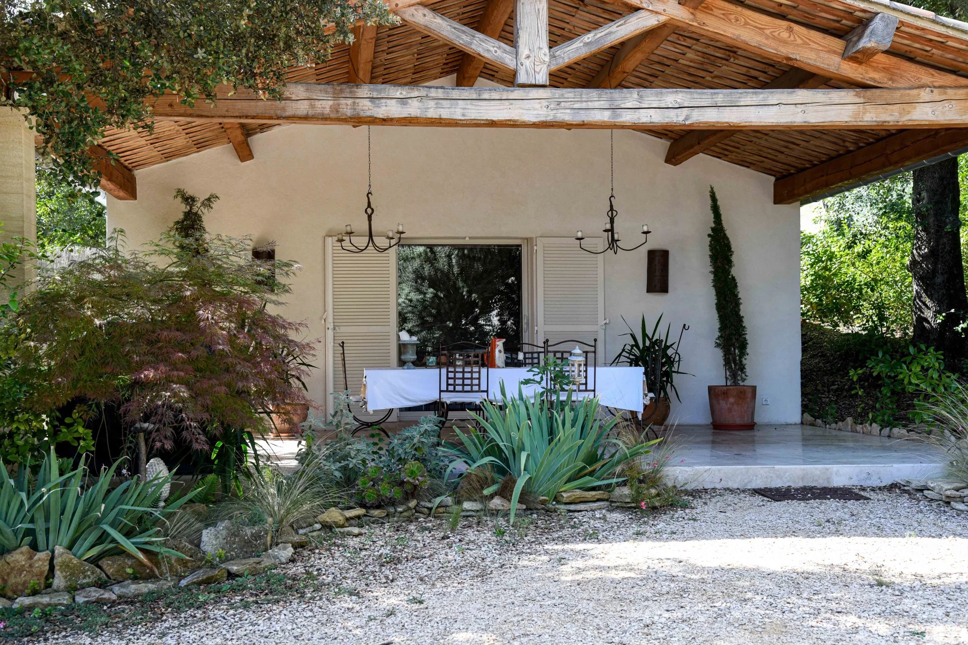 Devant la maison, la grande terrasse, plein sud, surplombe un magnifique jardin aux arbres et arbustes aux essences méditerranéennes, au milieu duquel ont été créés harmonieusement une piscine (12 X 5 au sel) et un pool house (petite cuisine d’appoint, coin repas, toilettes, douche). Juste derrière, le terrain de pétanque paysager attend les boulistes pour des moments de détente.